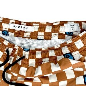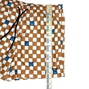 These PacSun's swim trunks, feature a blue peace sign and brown checkered pattern.