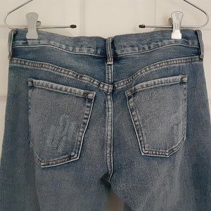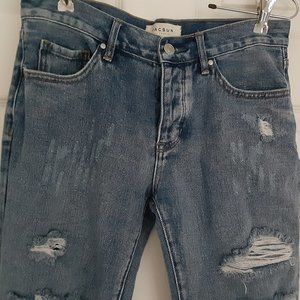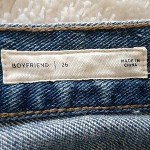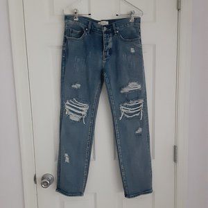 PacSun Boyfriend distressed denim blue jeans in a medium wash. 3 largest holes on thighs and knees are backed by denim material—they are not actual holes. Button fly (no zipper); silvertone hardware; 5 pockets—distressing on 2 back pockets. Excellent pre-loved condition—no stains.