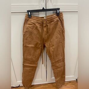 Comfortable brown joggers with drawstring waist. Features side pockets and elastic cuffs.