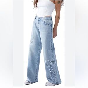 Super cute and hard-to-find PacSun Casey Low Rise Baggy Jeans featuring an embroidered bow detail on the leg for a playful, Y2K-inspired touch. Made from authentic rigid denim with a light indigo wash, these jeans have a flattering low-rise fit, wide leg, and casual, relaxed vibe.