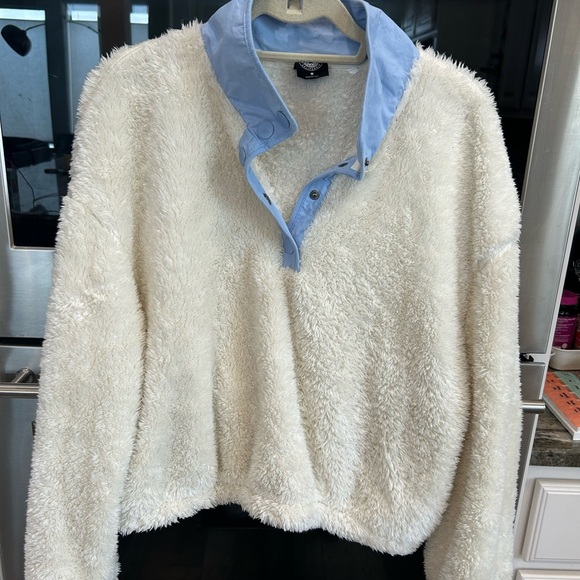 Cozy fuzzy sweatshirt with a light blue collar. Perfect for casual wear.