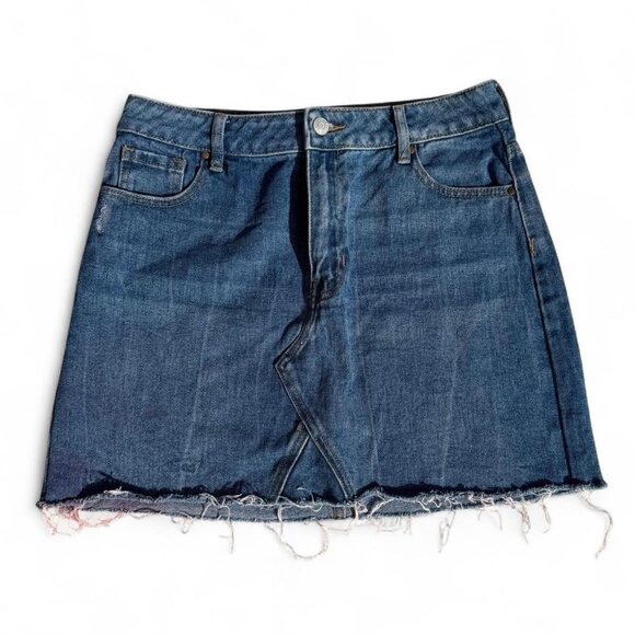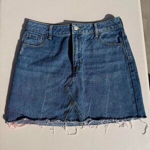 Y2K medium-wash denim mini w/ raw frayed hem + front overlap detail. Cute, casual + easy to style.