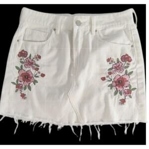 PacSun Embroidered Mini Skirt Women's Size 26 White Denim Fringe Hem Zip Front