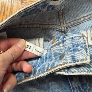 Trendy high rise PacSun jeans with distressed details. Perfect for a casual look. Very comfortable and the stretch is great. Waist is 13 inches.