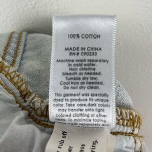 Classic pair of distressed denim shorts measuring 14 inches at the waist lying flat, 10 inches in length and with a 2 inch inseam.