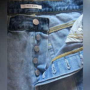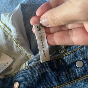 PacSun high rise patchwork straight leg jeans. Light and medium blue. 26" waist, 27" inseam (from crotch to hem). Frayed hems. Button fly. Like new, worn once.