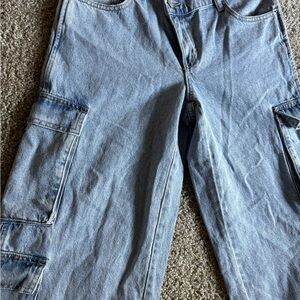 Trendy light blue straight leg jeans with cargo pockets. Ideal for casual wear.