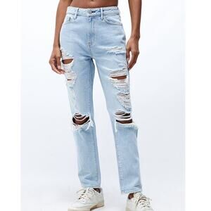 PacSun Light Wash Blue Edgy Distressed High Rise Ripped Mom Denim Jeans. Relaxed Fit, Tapered Fit.
