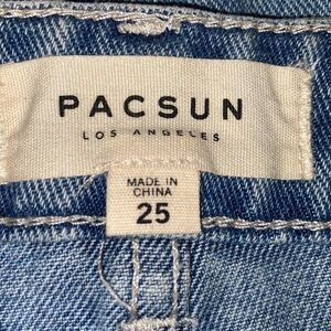 PacSun light wash denim mini skirt with raw edge hem. Trendy and versatile, perfect for summer outfits, casual days, or pairing with crop tops for a Y2K vibe.