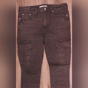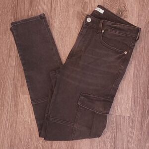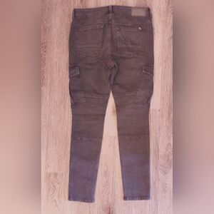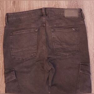 Zipper, button front, cargo pockets with snaps, plus 5 pockets, distressed and a little faded, stretchy,