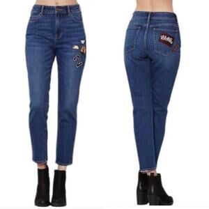 PacSun Punk Blue Los Angeles Patched High Rise Retro Fit Jeans. Retro style jeans from Pac Sun featuring Los Angeles inspired patches on both front and back. Button and zipper closure. Five pocket styling. Designed to hit at the ankle. Can be cuffed to style with ankle boots or left undone. 99% Cotton, 1% Spandex.