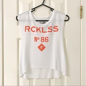 ⭐️NWT⭐️ A loose cropped tank made of stretchy material with low cut armholes. The text on the front is a bright orange color. The model shown in the photo wears a size small.