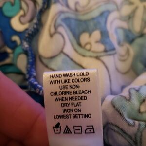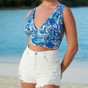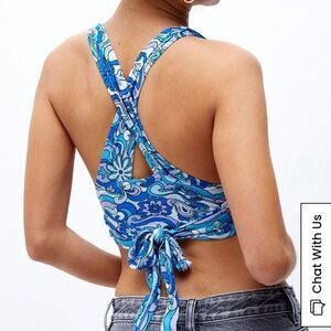 ~ Description: Blue and lavender paisley pattern crop top, tie detail in back, stretchy material
