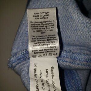 • Blue denim in a light wash with scallop detailing along the front hem and zipper closure in back.