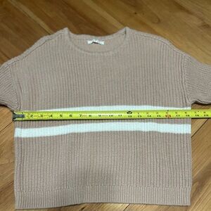 Stylish tan sweater featuring white stripes. Ideal for casual wear.
