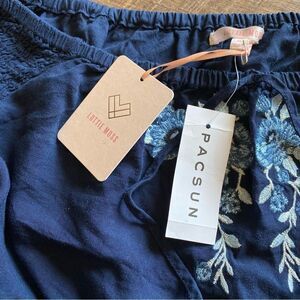 Gorgeous boho babe summer essential “Lottie Moss” off shoulder crop top from PacSun. New with tags. Size medium. Navy blue with smocked elastic shoulders/hem + boho bell sleeves. Please see photo section for approximate flat measurements + my model stats. Material: 85% viscose, 15% linen. Elastic: 69% polyester, 31% spandex.