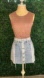 Chic two-tone denim skirt with button front. Frayed hem adds a trendy touch. Ideal for casual wear.