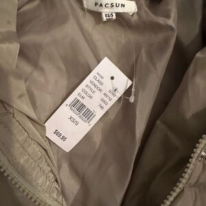 Very adorable like a light military green color. Zoos and snaps. Cords to tighten at bottom and hood. 2 side pockets and 1 zip chest pocket.