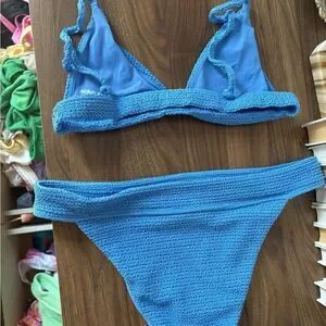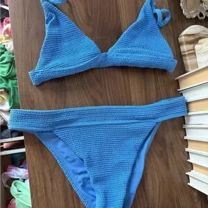 Dive into style with this stunning blue textured bikini set. Perfect for a day at the beach or lounging by the pool. Top size small, bottoms size medium