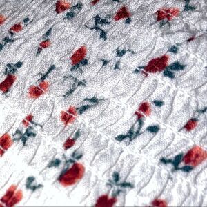 This little crop top is covered with little red roses. It’s elastic all over . The seller I purchased it from had it listed from Pacsun but the the tag says Lottie Moss. It’s made of 100% rayon. The straps are adjustable.