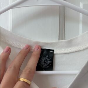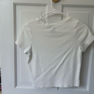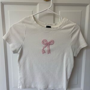 This PacSun crop top is a stylish addition to your wardrobe, featuring a fitted design with short sleeves. The white t-shirt is adorned with a subtle pink bow graphic, adding a touch of charm to its minimalistic style. Perfect for casual outings, this top pairs effortlessly with high-waisted jeans or skirts. Fits like a medium
