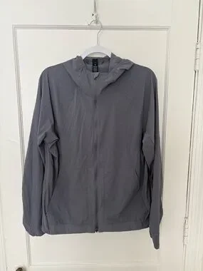 Excellent used condition. Lightweight and breathable running jacket with a 2-way zipper. Zipped hand pockets and a hidden pocket inside right hand pocket. Solar gray colorway.