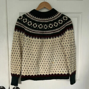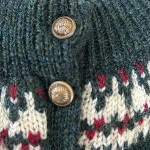 This is a Paul mace hundred percent wool sweater. Dry clean only. It is missing one button and has a couple of small stains on the back as seen in picture.