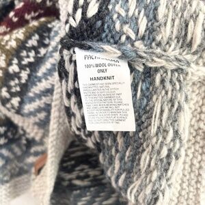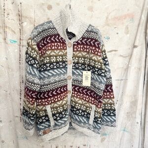 Pachamama hand knitted cardigan. Colourful fair isle striped pattern. 100% Wool. Fair trade and handmade in Nepal.