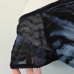 100% rayon. Black and blue tie dye. Embroidered "v-neck", ties at front of neck, lacy cap sleeves.