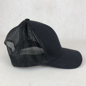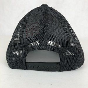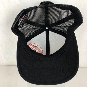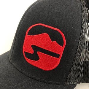 Unisex 104C Pro Model black red snapback baseball trucker hat cap. Adjustable snap back, logo on front, breathable mesh.