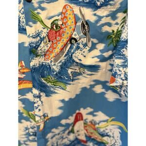 The Pacific Legend Hawaiian Shirt for men in size L is a vibrant and stylish piece featuring a water sports pattern, perfect for casual occasions like travel, parties, or everyday wear. Made in Hawaii, USA, this woven cotton shirt in blue color has a collared neckline with a button closure and short sleeves. The relaxed fit, spread collar style, and Hawaiian theme make it a standout choice for those looking to add a touch of tropical flair to their wardrobe. Machine washable and with a chest size of 42”, this Hawaiian shirt is ideal for summer, fall, and spring seasons.