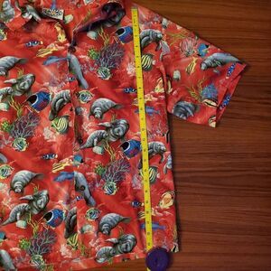 Tropical button down shirt with cute manatee print fabric. Buttons are coconut shell. This is in good pre-owned condition. Size tag is missing. Please use measurements provided.