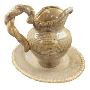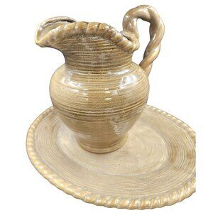 This Pacific Rim Hand Painted Pitcher and Oval Platter set of 2 in a taupe, tan, brown, and sandy brown with greenish undertones, adds a unique touch to kitchen or bathroom decor. Made of ceramic pottery, its twisted border design is striking.