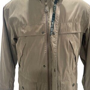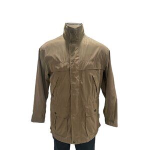 Khaki jacket, multiple pockets, high collar, front zipper, button closure, Pacific Trail brand, size Small, adventure wear
