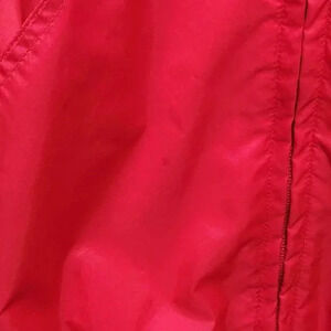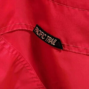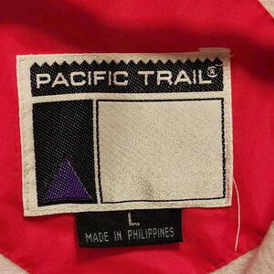 Vintage Pacific Trail size large, neon pink windbreaker. Jacket is lined, has two front pockets and a hood that can be stored in the back collar. Elastic waistband and cuffs. Cotton, polyester, nylon, and acrylic, made in the Philippines, machine washable.