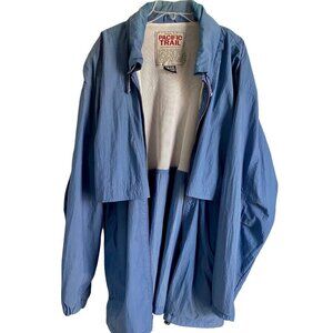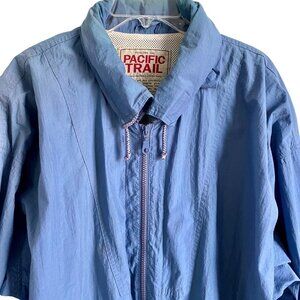 Pacific Trail Blue Windbreaker Jacket Coat with Hideaway Hood. Full Zip, 2 front zippered pockets. 100% Nylon, Lining 100% Polyester. Machine Washable. Size XLT r with approximate measurements laying85" pit to pit, length 36", sleeve length 27".