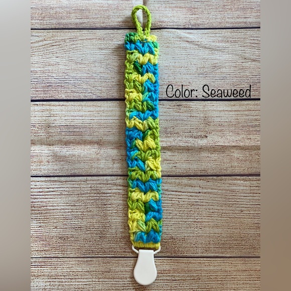 Handmade, crochet, pacifier clip. Made with 100% cotton yarn. Plastic clip. Approximately 10” including clip and loop.