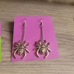 Set of 3 handmade silver gothic alt earrings featuring a pair with crow skull charms, a pair with skeleton hands, and a pair with spiders dangling from a short chain. Handmade by me, all earrings come with backings and are in new condition, made using new store bought materials with a lead and nickel free zinc alloy. I make some for myself and they haven't turned my ears green and I am pretty sensitive but obviously every body's body is different :)