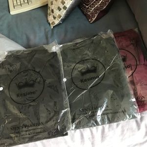 Selling three dress shirts in package together (dark green, black, and wine red). Please note, other colors not available. Brand new, never worn. These are 18-inch neck, slim fit.