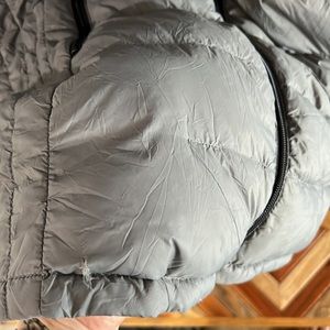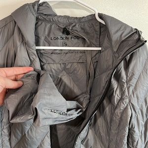 Grey, packable London Fog puffer. Comes with bag it packs into. I’m 5’9 and it hits just below my butt. Has small hole and snag. See pictures.