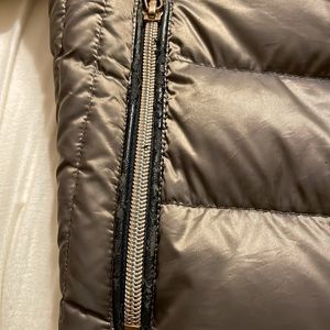 Easy packable jacket with bag. Color is a bronze-like metallic with gold hardware. It’s been previously worn but only damage is peeling of the black lining. Pictured last. Still looks great!