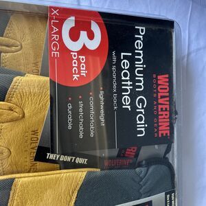 This package includes 3 pairs of Wolverine Premium Grain Leather Gloves in size X-Large. The gloves are solid beige in color with a wrist length and made of high-quality leather. Perfect for workwear or driving during the winter season, these gloves offer durability and protection for your hands. From the reputable brand Wolverine, these gloves are designed for men and do not come personalized. Ideal for those looking for reliable and stylish leather gloves for various activities.