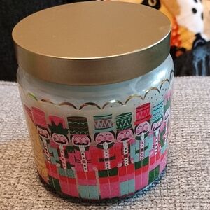 Scented candle with festive design. Perfect for holiday ambiance.