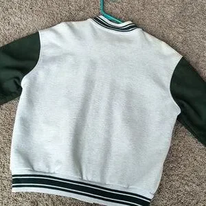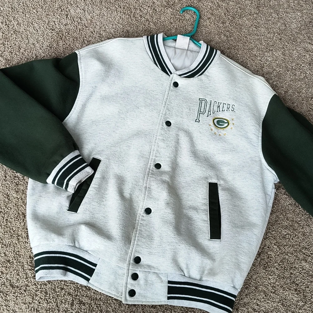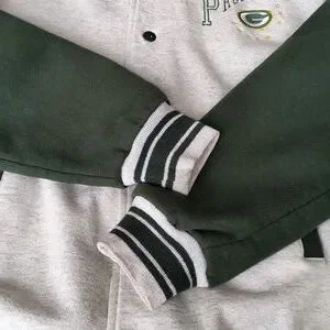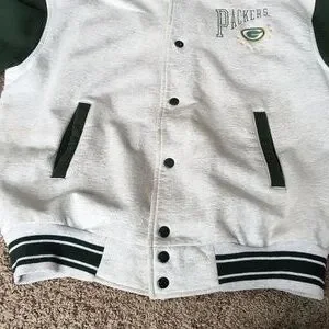 Green Bay Packers logo, stars, and Packers embroidered on left chest. Two front slit pockets. Varsity style sleeves, collar, cuffs. Fully lined. Snap front closure.