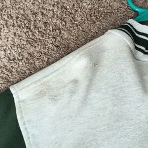 Needs a wash as there is dust and dirt at the front opening, shoulders, and upper back, as well as right side. I have not washed or tired to treat these areas. One small snag at upper left back shoulder area. Otherwise nice condition!