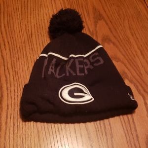 Green Bay Packers hat with puffball on top. G logo on one side and packers logo on other side.
