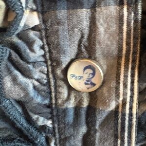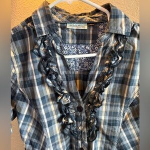 Chic blue plaid button down shirt dress with ruffle accents at neckline.