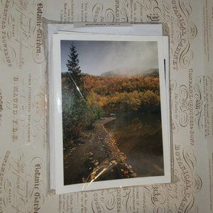 Set of 8 beautiful new notecards in a packet entitled "Adirondack Light 2". Each notecard depicting a copy of a different photograph of the Adirondack region taken by Karen Stolz (Vertical Perspectives Photography). Eight white envelopes included. Each notecard measures approx. 4 3/8" x 5 3/4". One of each picture. Cards are blank inside. Cards/envelopes in original packing but no tag. NWOT - packet was opened & resealed after photographing for this post. Notecards have been stored in a cabinet. Smoke free home. Please see photos. The photos are part of the description.
