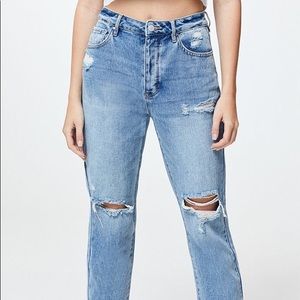 These Favorite Blue Mom Jeans have a rigid fabrication for a nod to throwback fashion. They offer a super high rise fit, naturally cinched waist, relaxed leg, and destructed detailing.