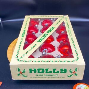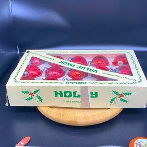 Vintage glass Christmas ornaments that are whole and unbroken with some crackling of paint on some of the globes observed. Box is intact with some tears